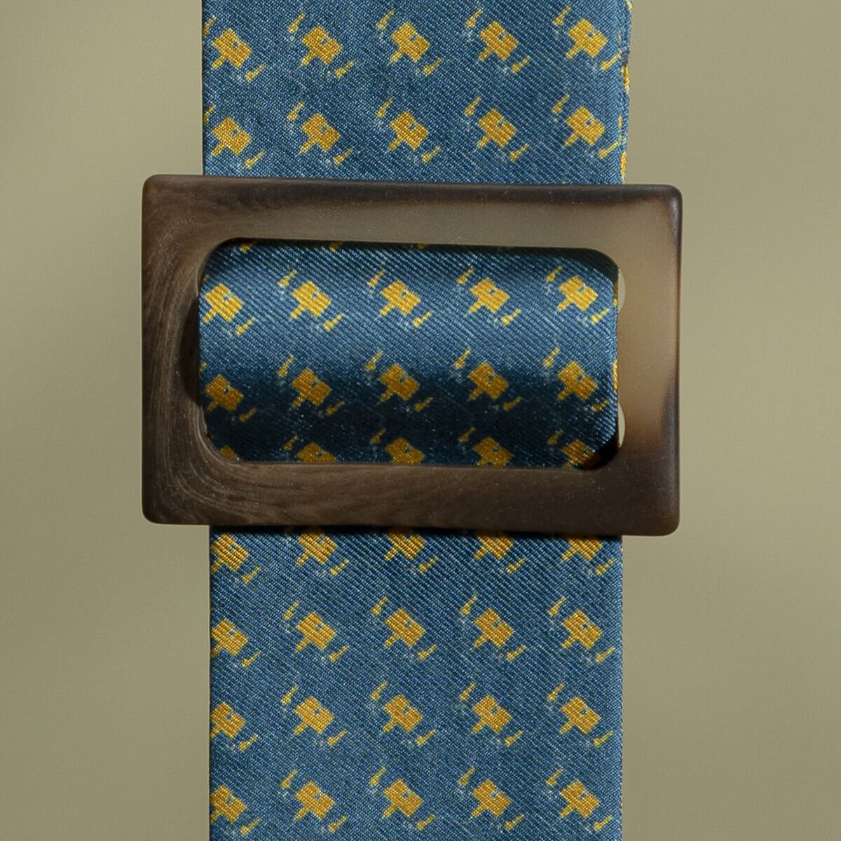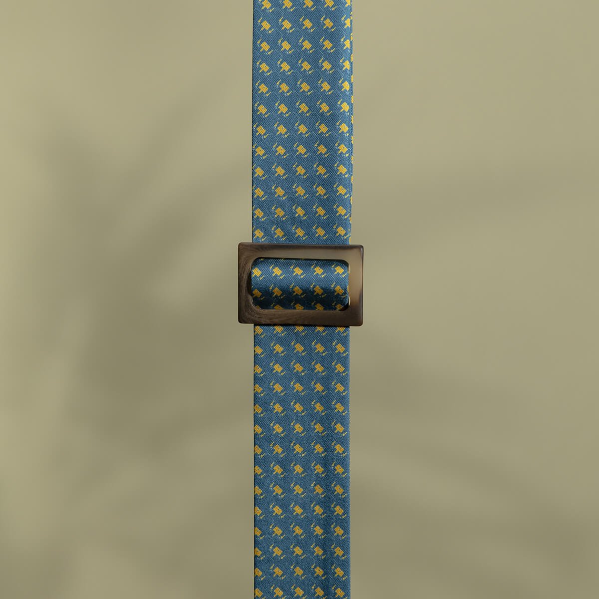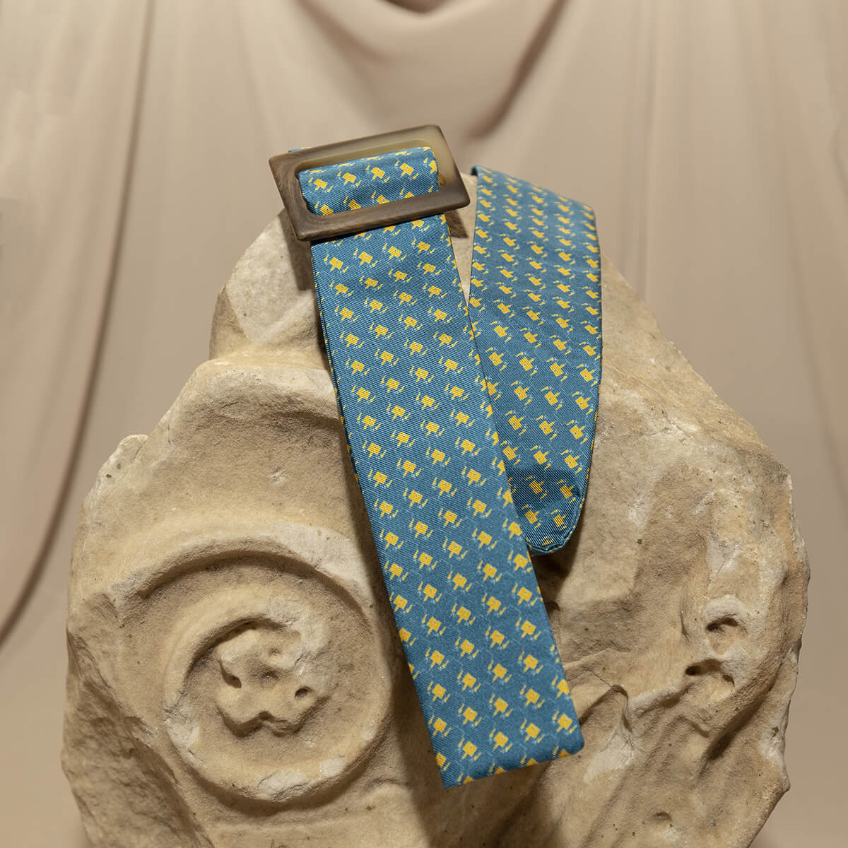 L’edificio principale di piazza del Campidoglio a Roma ha ispirato il design di questa cintura, di colore azzurro e giallo. La cinta è di seta intelaiata, con fibbia in resina tartarugata fermata con travetti cuciti a mano.